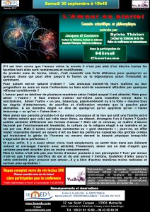 Pour la 3ème fois au Med’s, nous aborderons cet inépuisable thème. L’amour se décline de bien des façons… Nous répondrons à vos questions, échangerons, et débattrons, avec des intermèdes musicaux, pendant lesquels de magnifiques chansons intemporelles seront interprétées.. avec tendresse, poésie et amour..